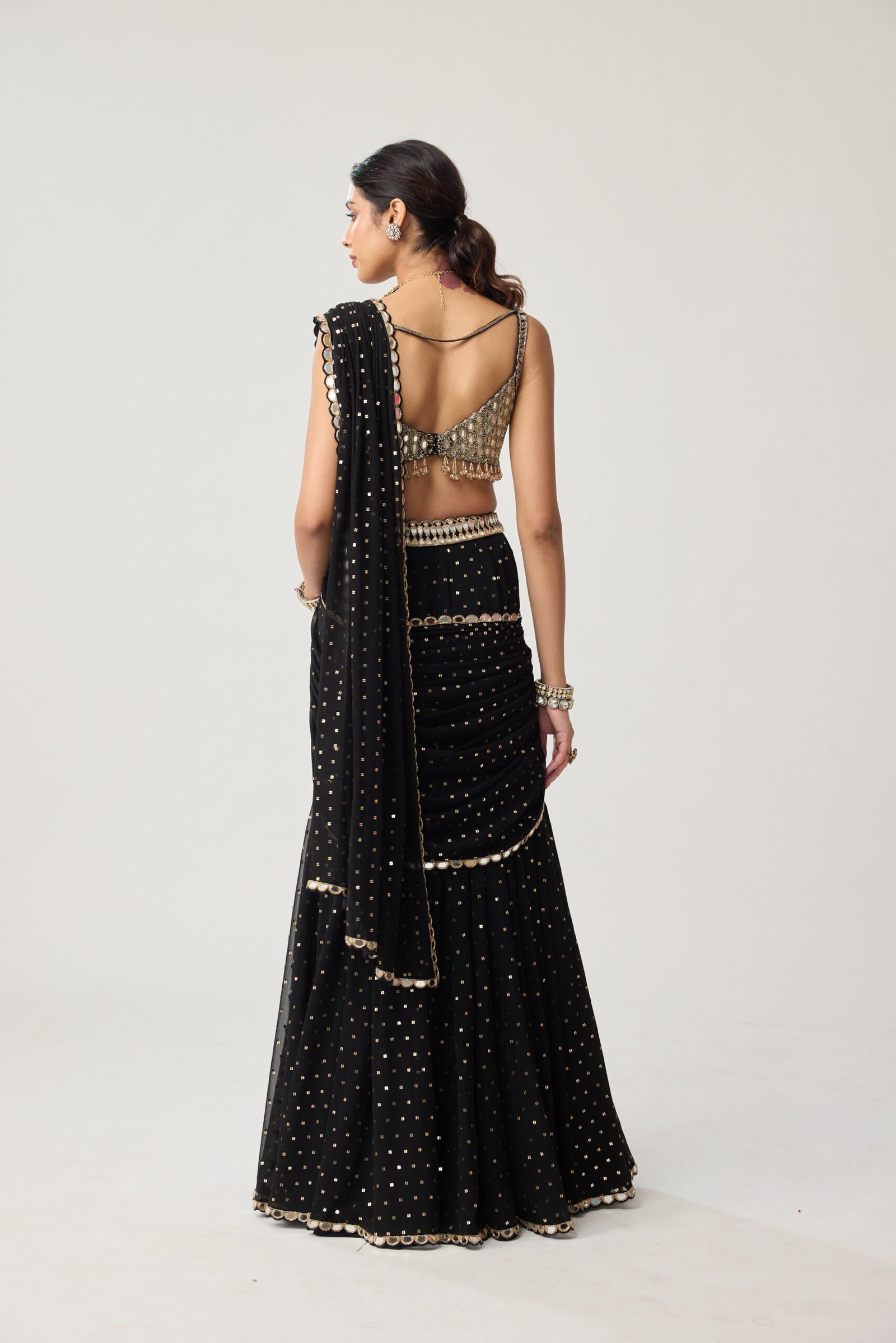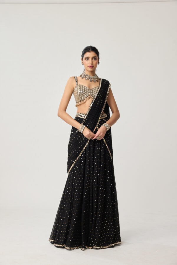 Black Georgette flared pants Saree with Real Hand Cut Mirror Embroidered Sleeveless Blouse.