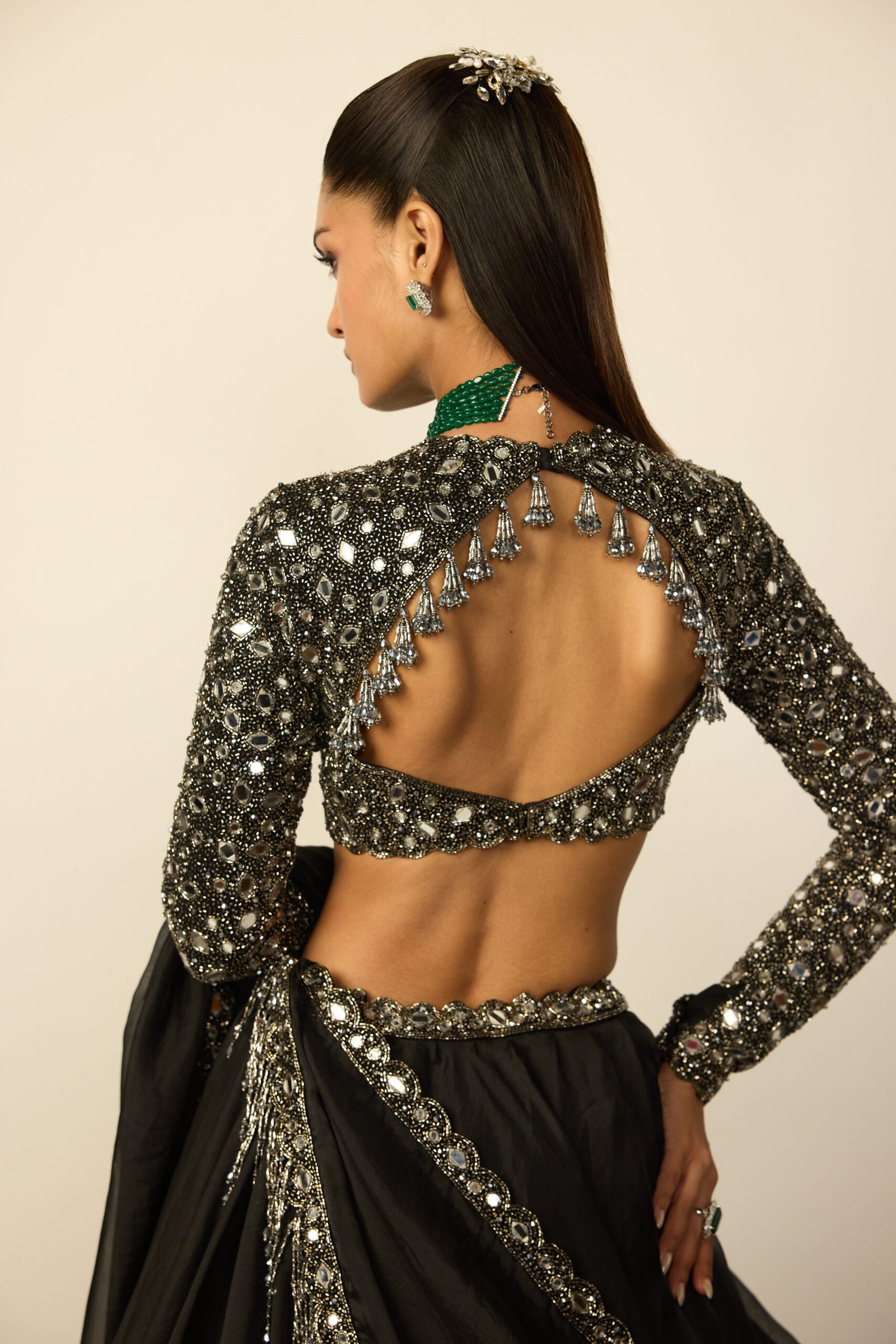 Black Organza Lehenga, paired with a heavily embroidered Zero neck blouse and a dupatta with cascading silver tassels.