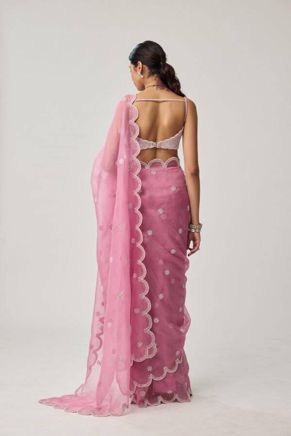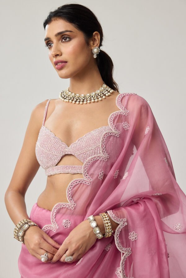 Blush Pink Organza saree set, adorned with mirror and pearl embroidery, paired with a heavily embroidered blouse.