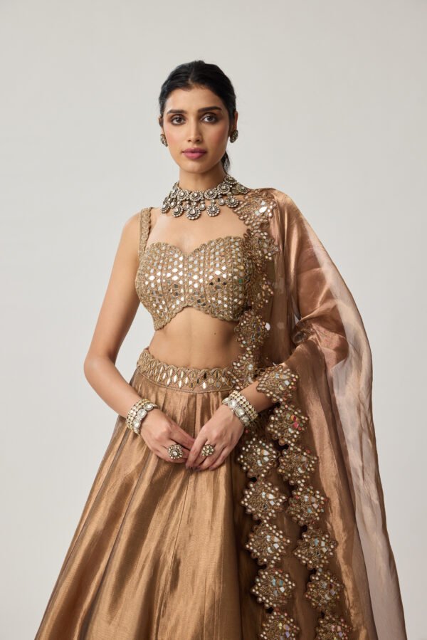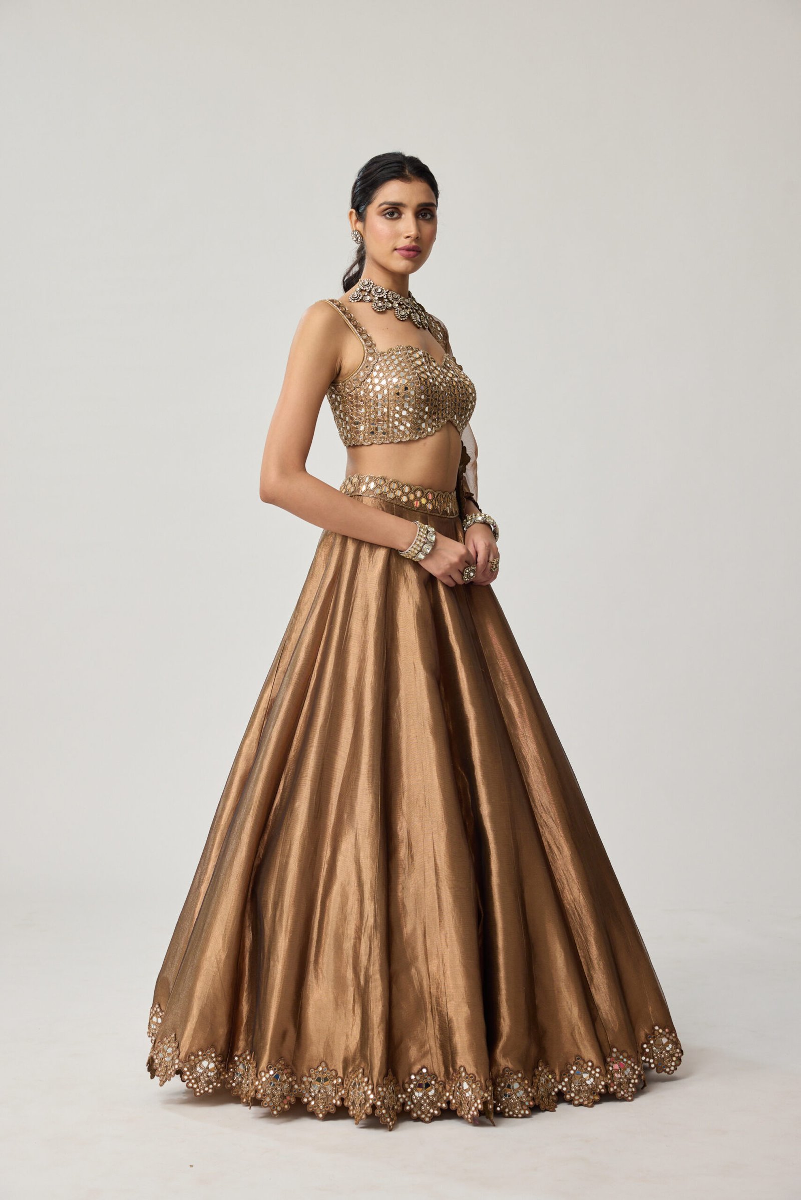 Copper Shimmer Organza Lehenga And Dupatta Clubbled With Real Hand Cut Mirror Embroidered Blouse.