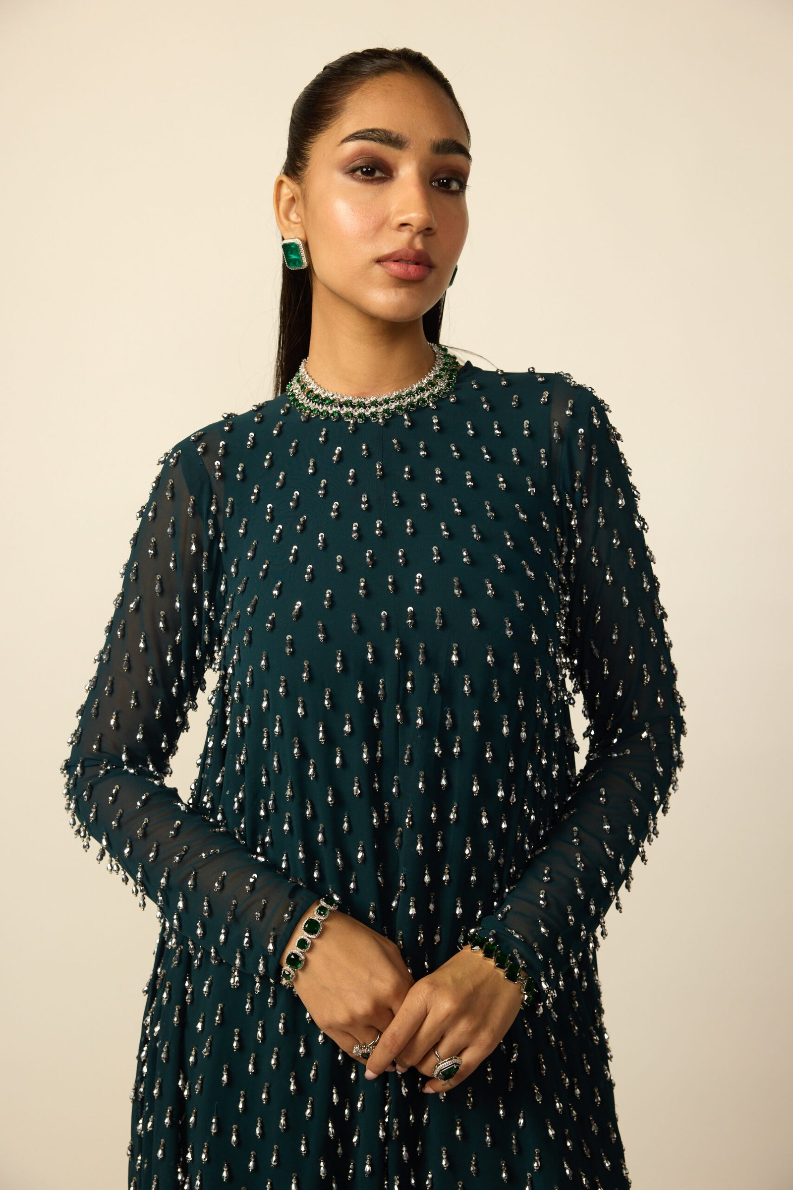 Dark Teal Silver Drop Kurta With Stole