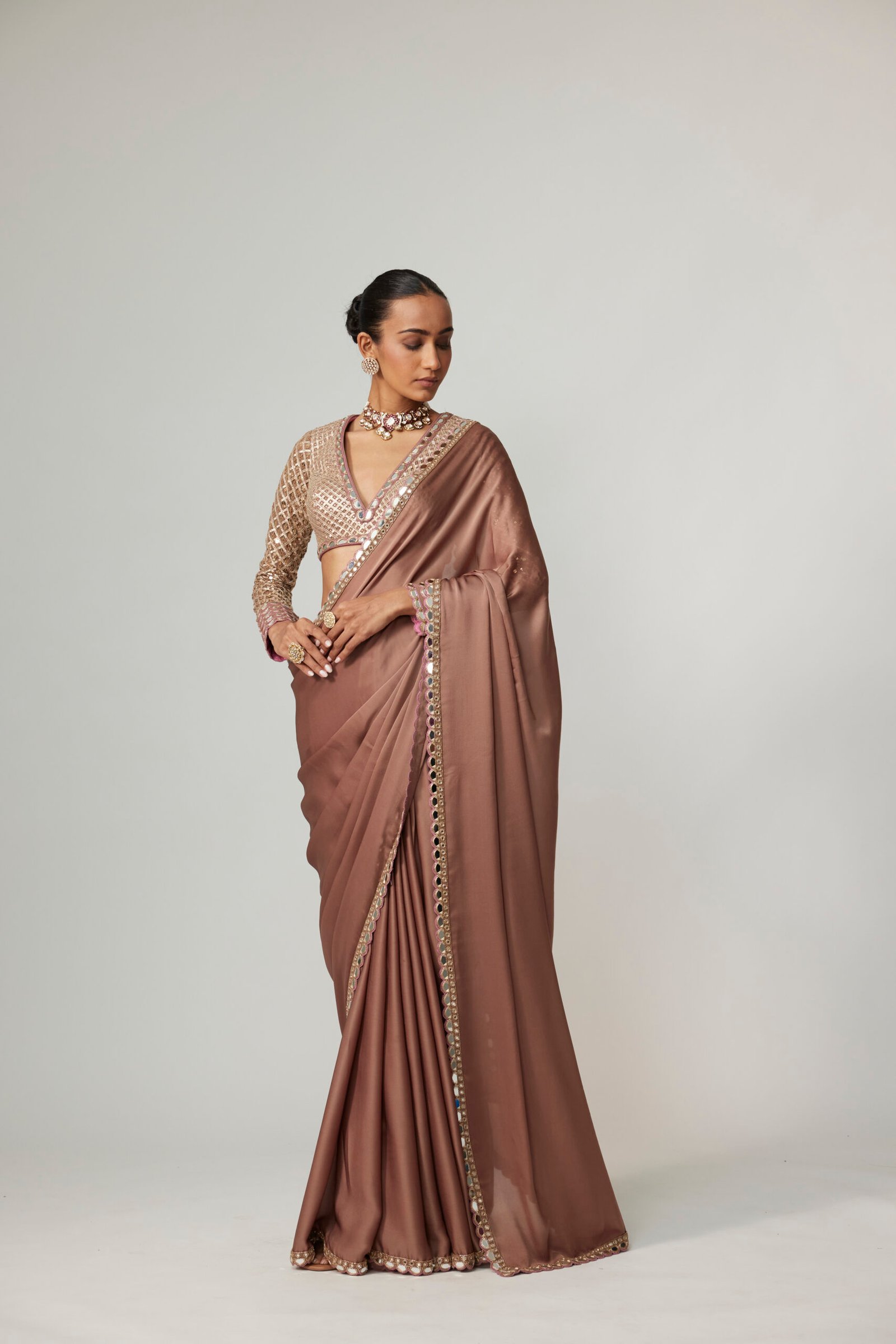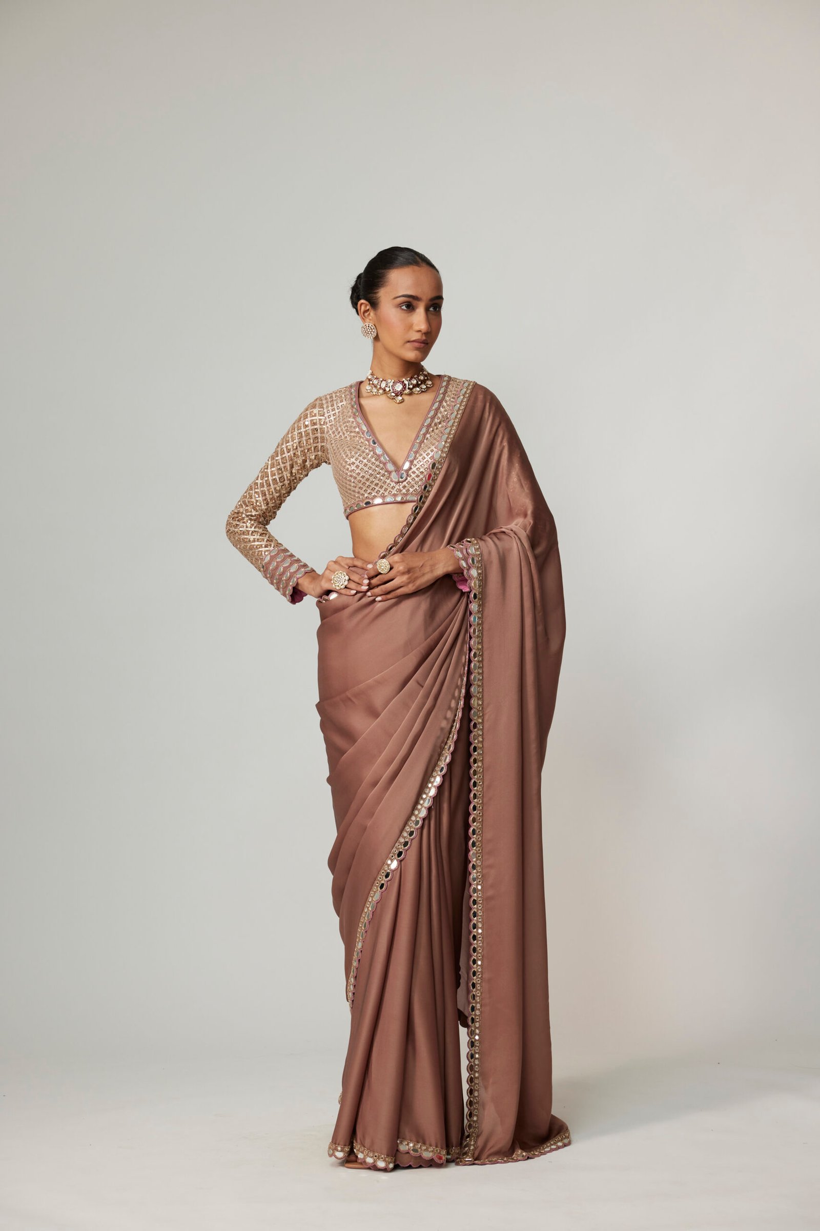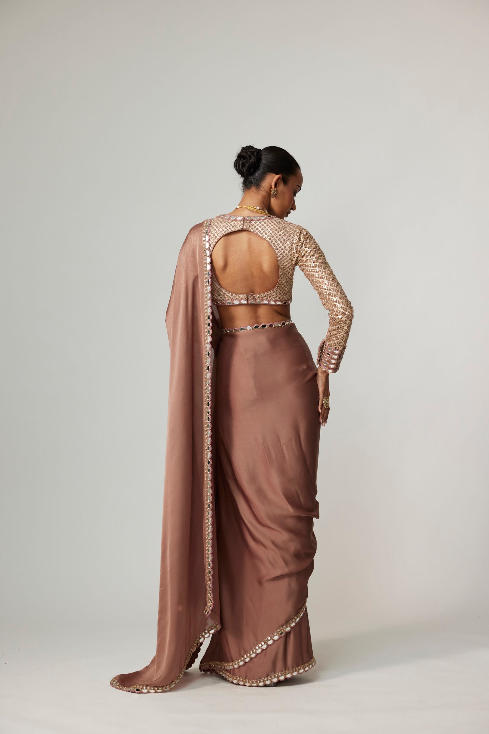 Deep Beige Satin Saree, adorned with golden gota embroidery, paired with a full sleeve V neck Blouse.