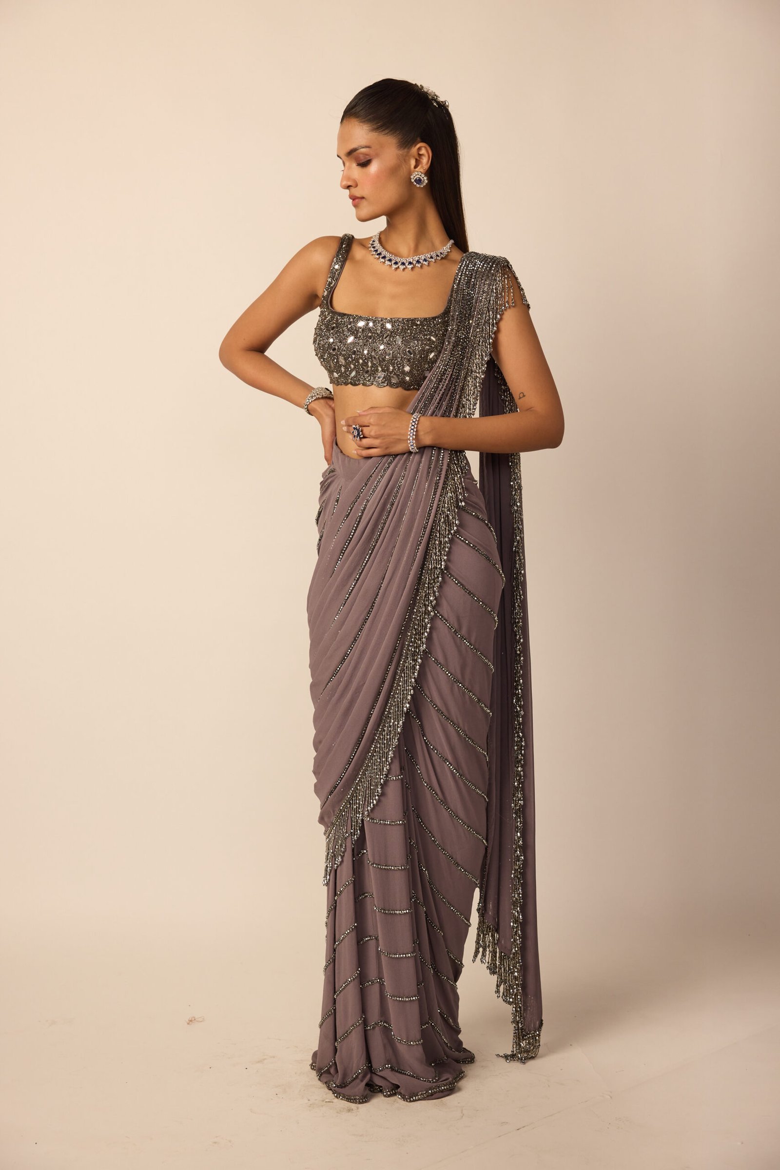 Metallic Grey Linear Draped Saree with Cascading Silver Tassels with a hand Cut Mirror and cutdana Embroidered blouse.