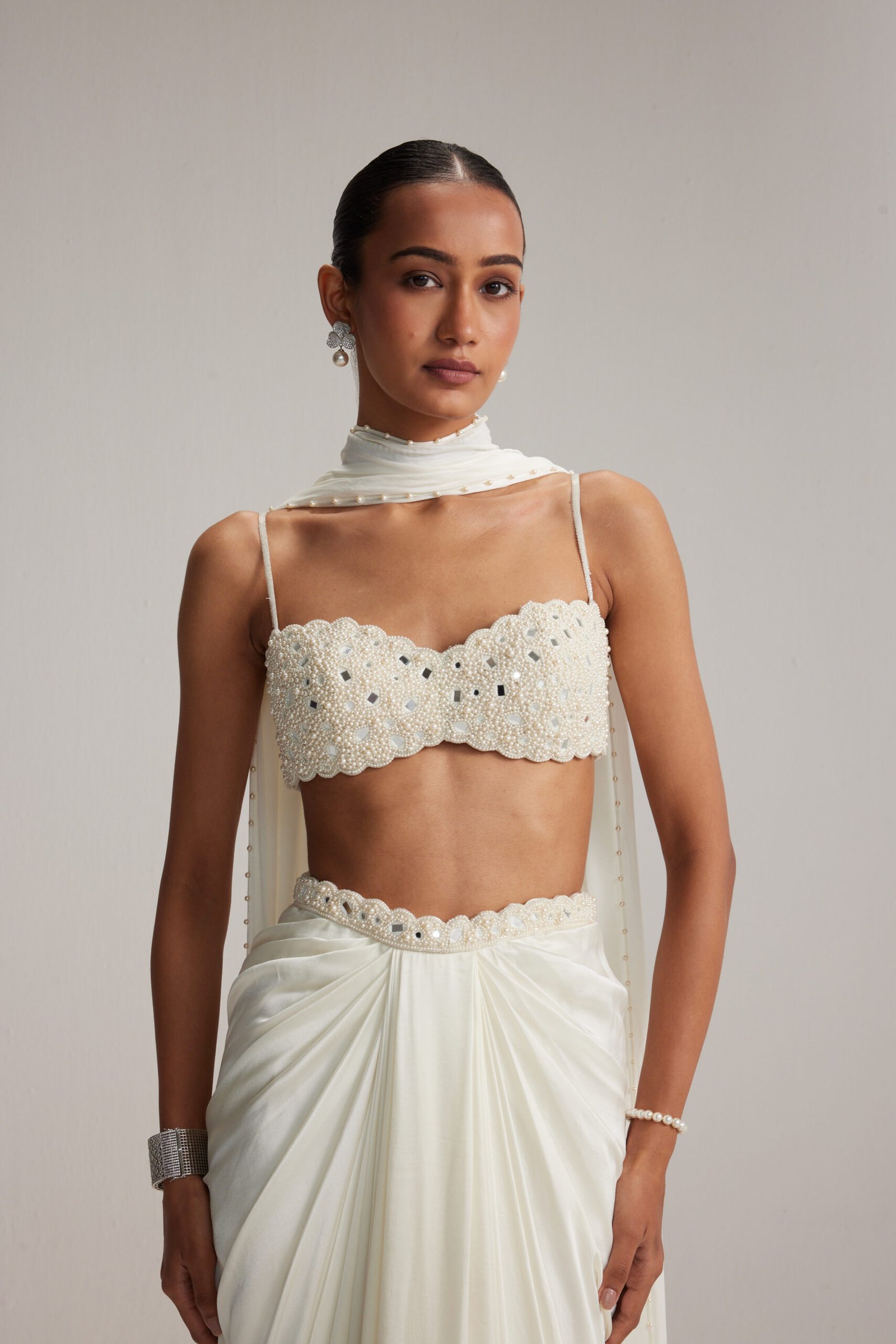 Off White Satin draped skirt set paired with a heavily embroidered mirror and pearl blouse and a satin stole.