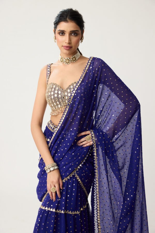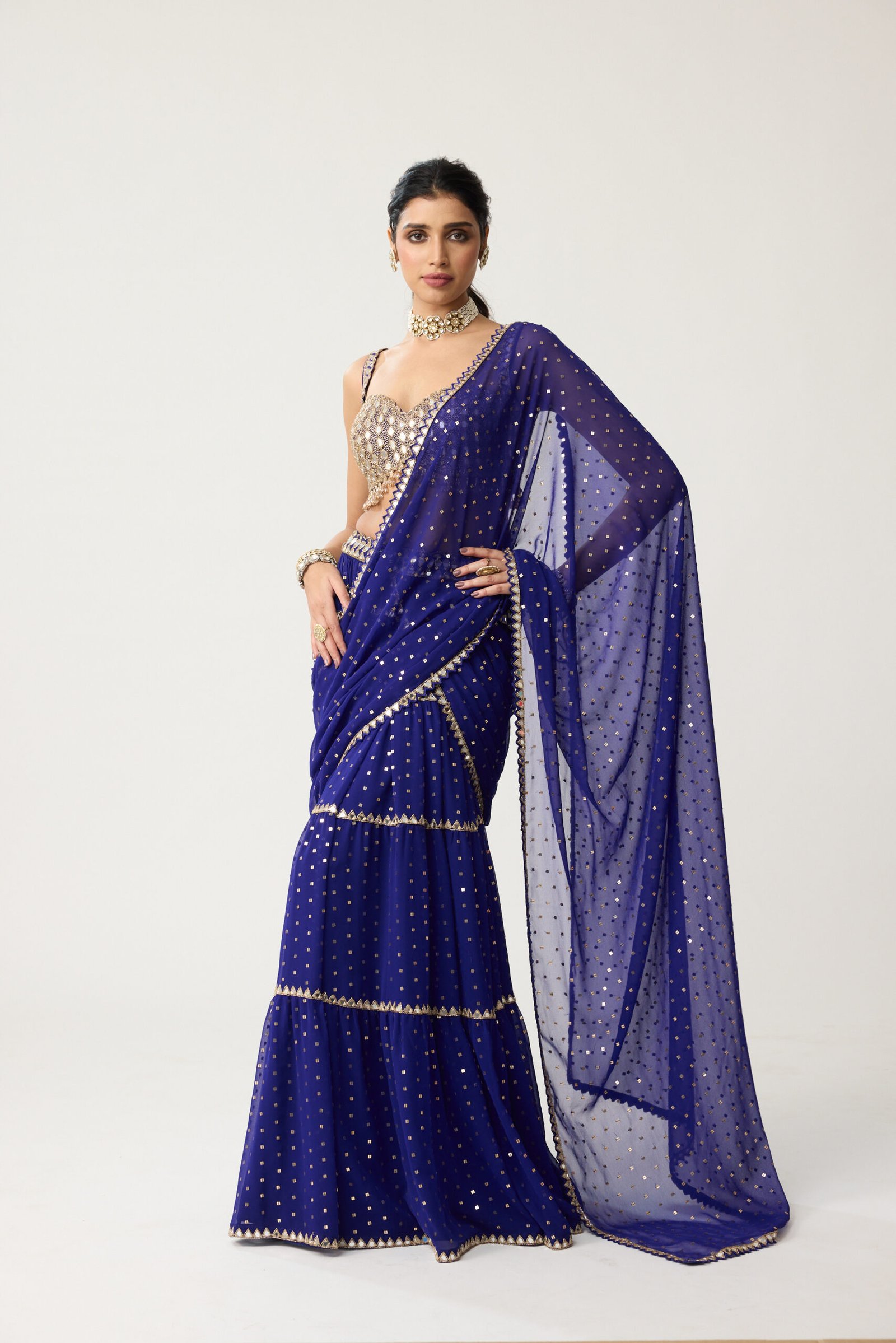 Persian Blue Multi-tier Mirror hand embroidered Georgette Saree clubbed with real hand cut mirror embroidered sleeveless blouse.