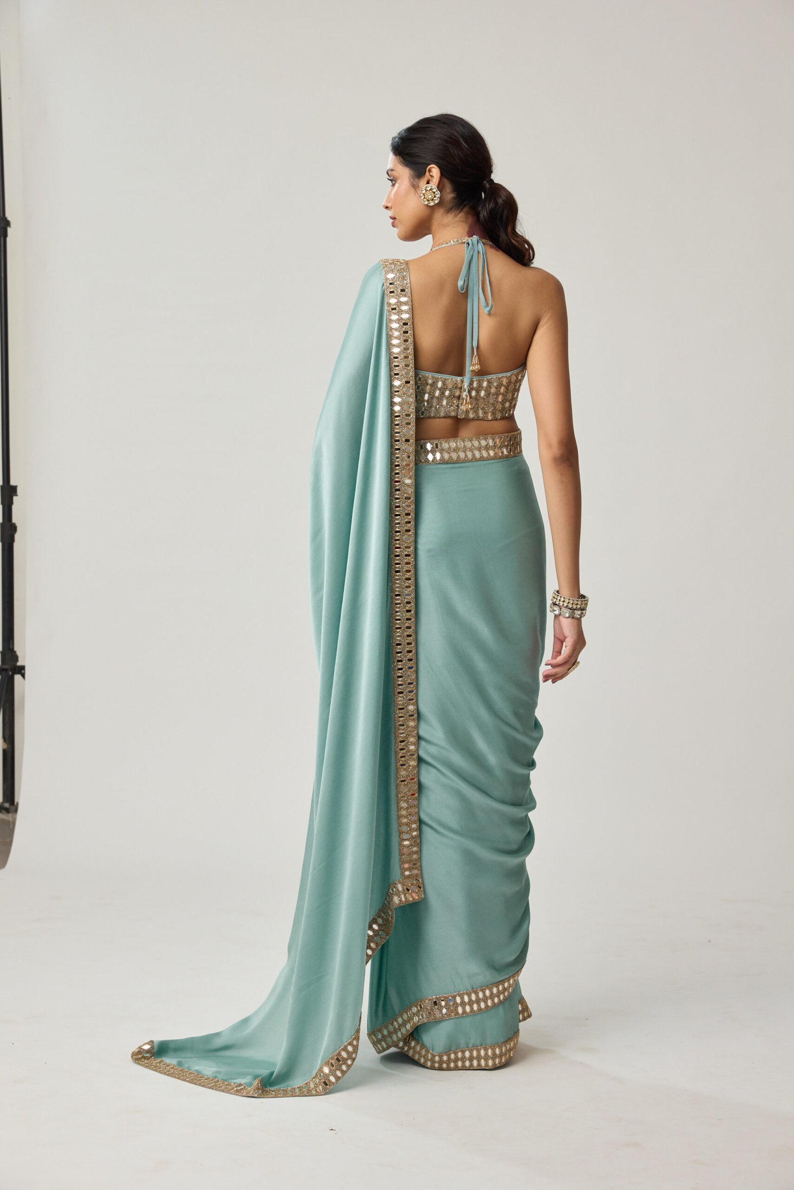 Powder Blue Satin Saree Clubbed with Real Hand Cut Mirror Embroidered Halter Neck Blouse.