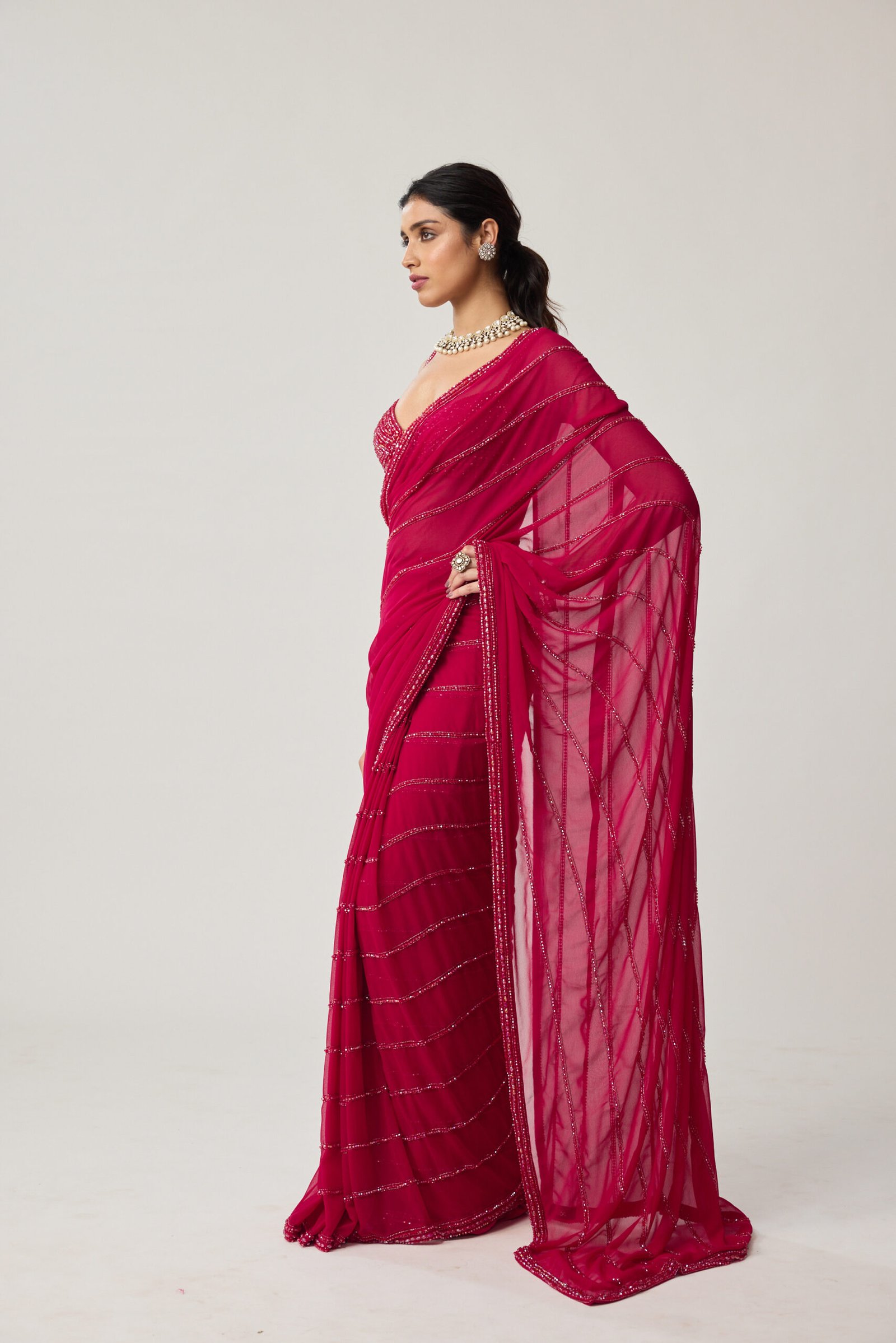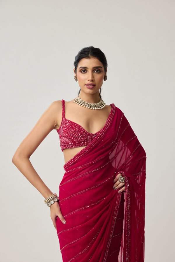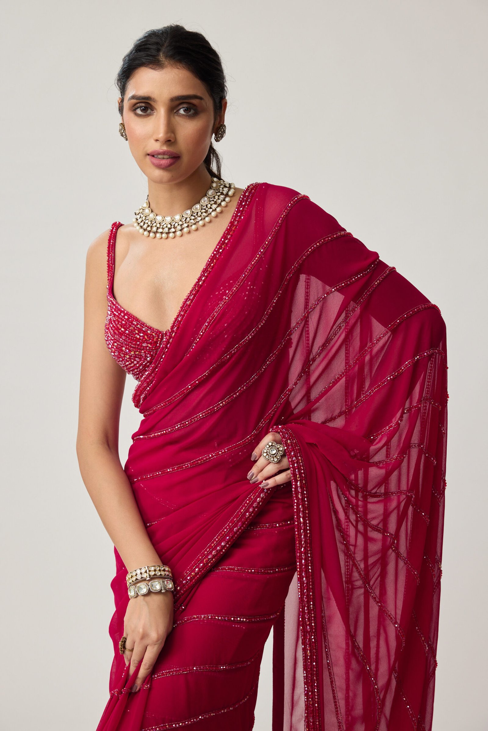 Ruby Red Crystal embroidered Georgette Saree clubbed with Crystal embroidered sleeveless blouse.
